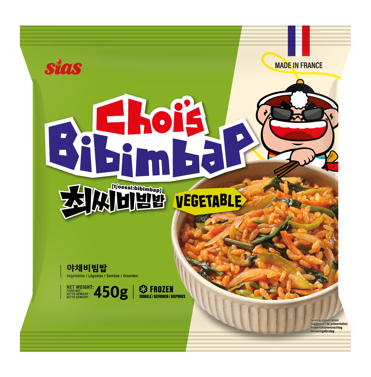 Riz cuit 60,3%* [eau, riz], légumes en proportion variables 25%* [oignon, courgette, carotte, épinard], sauce piquante 9,5%* [gochujang 5,7%* (eau, sirop de tapioca, riz complet, poudre de piment rouge, sel, alcool 2,5%, ail, oignon), eau, sauce SOJA (contient SOJA, BLÉ (GLUTEN)), sel, sucre, arôme naturel, fécule], huile de tournesol, ail, jus concentré de poivron, piment gochugaru, fécule, huile de SÉSAME. *dans le produit fini