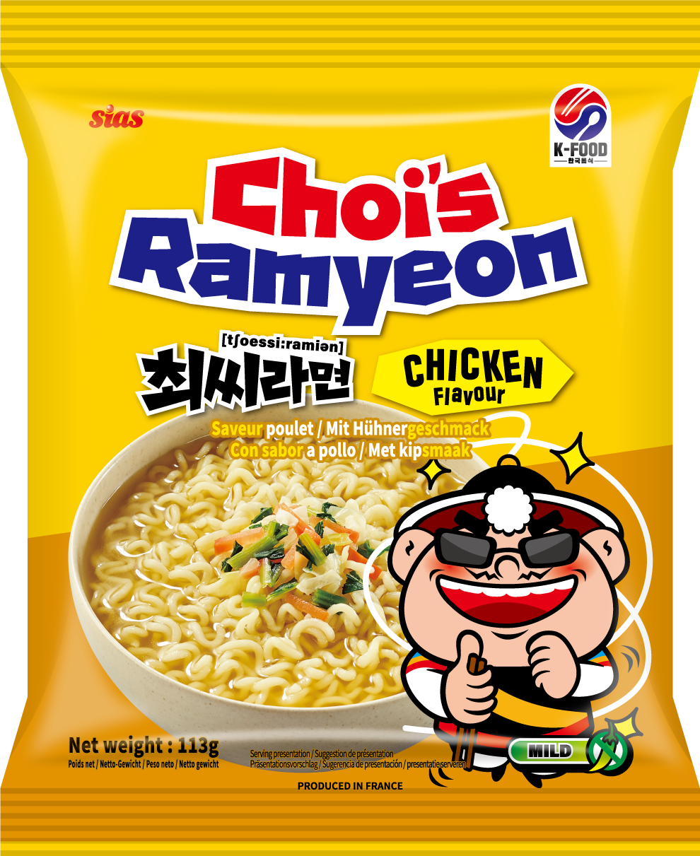 Nouilles de blé instantanées avec une sauce d’assaisonnement saveur poulet.